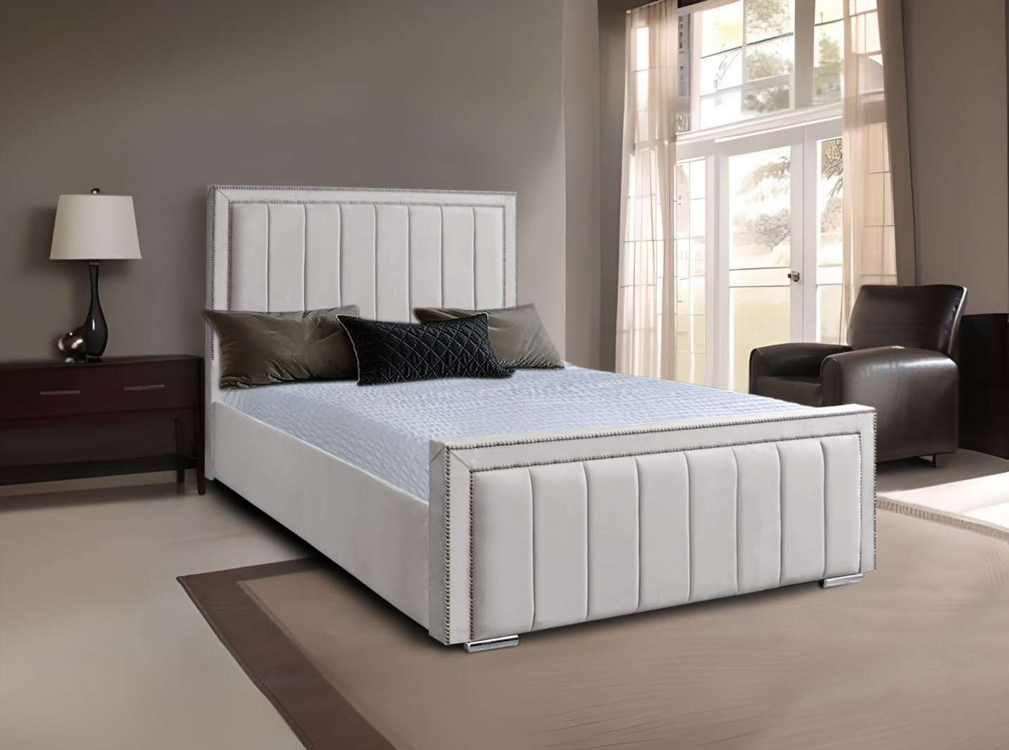 The 2024 Myla Upholstered Studded Bed is distinguished as it embraces elegance with its eye catching chrome studded headboard, footboard and by its beautiful chrome feet which bring a sophisticated flair to your bedroom. The standard headboard height provides increased comfort and support.